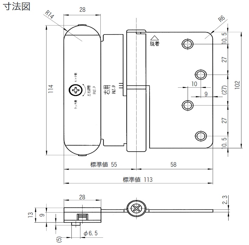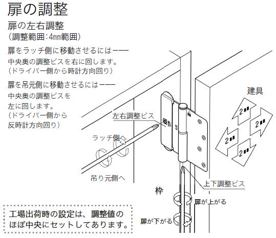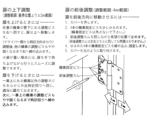 DAIYASU 三次元調整機能付 室内建具蝶番 AE-3DC DAIYASU 三次元調整機能付 室内建具蝶番 AE-3DC 上下調整値 ±2mm 左右調整値 4mm範囲内 前後調整値 ±2mm 定格荷重 15kg/蝶番1枚 推奨扉厚 33~40mm 推奨枠厚 24~30mm 扉の上下、左右、前後調整が可能なので扉施工後のチリ修正が簡単です。 オリジナルカバーの装着により、扉を開いた時の外観がスッキリと見えます。 取り付けビス付き 品番 左右 入数 価格 購入数 AE-3DC-WB-L 左用 1枚 1,690 - + AE-3DC-WB-R 右用 1枚 1,690 - +