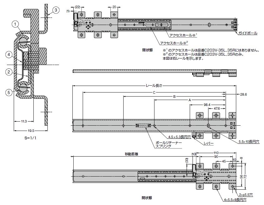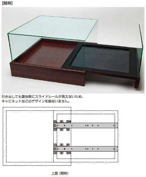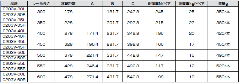 LAMP スライドレール C203V 底引きタイプ 引き出しの底にレールを取り付ける底引きタイプです。 引き出しても筐体側にスライドレールが見えません。 セルフ&ソフトクロージング装置がレールに内臓されているため、 従来のレール同様に取り付けが簡単です。 レバー操作でアウターメンバーを取り外せます。 本体の厚みは、わずか19.5mmと薄型です。 スライドレールC203V 底引きタイプ 材質 鋼 品名 レール長さ 移動距離 入数 (左右セット) 価格 購入数 C203V-30LR 300 175 1セット 5,430 - + C203V-35LR 350 178 1セット 5,830 - + C203V-40LR 400 228 1セット 6,160 - + C203V-45LR 450 328 1セット 6,485 - + C203V-50LR 500 378 1セット 6,660 - + C203V-55LR 550 428 1セット 7,140 - + C203V-60LR 600 478 1セット 7,390 - + スライドレールC203V 底引きタイプ 箱売り 材質 鋼 品名 レール長さ 耐荷重 (kgf) 入数 (左右セット) 価格 購入数 C203V-30LR (10セット) 300 175 1セット 52,195 - + C203V-35LR (10セット) 350 178 1セット 56,050 - + C203V-40LR (10セット) 400 228 1セット 59,200 - + C203V-45LR (10セット) 450 328 1セット 62,350 - + C203V-50LR (10セット) 500 378 1セット 64,065 - + C203V-55LR (10セット) 550 428 1セット 68,640 - + C203V-60LR (10セット) 600 478 1セット 71,070 - +