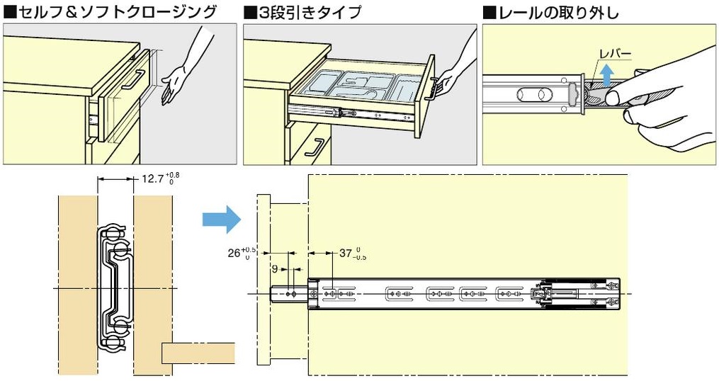 LAMP スライドレール 4670 ブラック(黒) ソフト&クロージング レバー操作でインナーメンバーを取り外せます。 アウターメンバー取付部の衝撃吸収効果によりキャビネットの多少の変形にもスムーズなスライドが得られます。 スライドレール4670(ソフト&クロージング) ブラック 材質 鋼 品名 レール長さ 入数 (左右セット) 価格 購入数 4670-250BL 250 1セット 4,980 - + 4670-300BL 300 1セット 5,160 - + 4670-350BL 350 1セット 5,250 - + 4670-400BL 400 1セット 5,340 - + 4670-450BL 450 1セット 5,700 - + 4670-500BL 500 1セット 6,070 - + 4670-550BL 550 1セット 6,250 - + 4670-600BL 600 1セット 6,975 - +