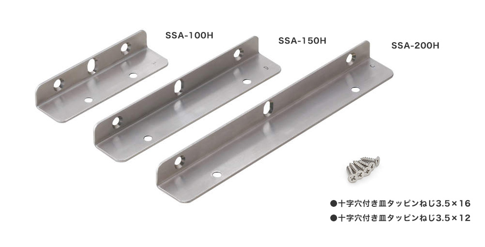 LAMP ステンレス鋼製棚受アングル SSA型 W280、W380、W480が新たに加わりました。 受け部が広く安定したL型の棚受です。 取付部が棚板に隠れ、すっきりとした納まりになります。 中央の穴が長穴のため、仮止め後、上下それぞれ2 mmの調整ができます。 LAMP ステンレス鋼製棚受アングル SSA型 材質 SUS304 仕上 ヘアーライン 耐荷重 (N) 1470、(kgf) 150 ※棚板1枚あたりアングル2ヶ使いの数値 付属品 十字穴付き皿タッピンねじ3.5×16(ステンレス鋼) 十字穴付き皿タッピンねじ3.5×12(ステンレス鋼) 品番 サイズ W/p1/P2 入数 価格 購入数 SSA-100H 100/60/40 1個 948 - + SSA-150H 150/110/90 1個 1,081 - + SSA-200H 200/160/130 1個 1,305 - +