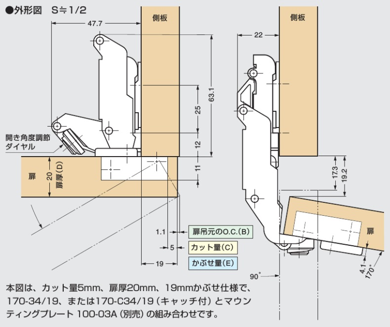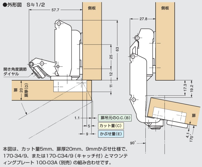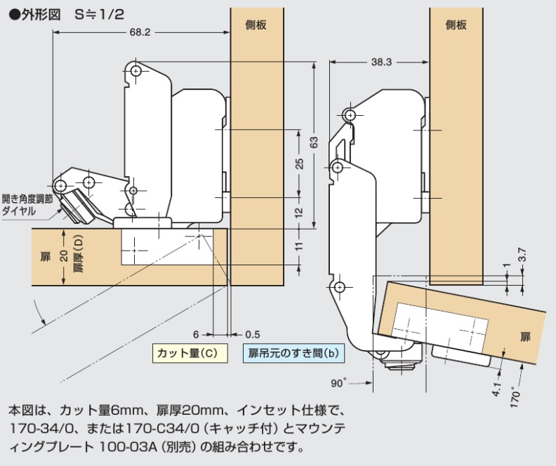 LAMP スライド丁番 170シリーズ 170°開き キャッチとは スライド丁番の「キャッチ」とは本体の首のところに付いたバネのことです。 キャッチあり・なしの見た目の違いはありません。 キャッチあり 扉がある程度閉まるとバタンと閉まるもの キャッチなし 自動で閉まらない扉の場合 3個付けの時「キャッチあり」3個だと力が強すぎるので真ん中のものを「キャッチなし」にしたりします 座金(マウンティングプレート)とは 座金(マウンティングプレート)とは本体を取り付けるための金具です。 購入の際、二点座、三点座、四点座を選んでいただきます。 「二点座」、「三点座」、「四点座」の違いはネジの取り付ける数です。お好みで選ばれて結構です。 ■取付ビスは別売りです■ 170-34/19 19ミリかぶせ 35カップ座金付 品番 付加機能 入数 価格 購入数 170-34/19 キャッチあり 1個 1,310 二点座三点座四点座 - + 170-34/19 キャッチなし 1個 1,200 二点座三点座四点座 - + 170-34/9 9ミリかぶせ 35カップ座金付 品番 付加機能 入数 価格 購入数 170-34/9 キャッチあり 1個 1,450 二点座三点座四点座 - + 170-34/9 キャッチなし 1個 1,345 二点座三点座四点座 - + 170-34/0 インセット 35カップ座金付 品番 付加機能 入数 価格 購入数 170-34/0 キャッチあり 1個 1,525 二点座三点座四点座 - + 170-34/0 キャッチなし 1個 1,445 二点座三点座四点座 - + スライド丁番用ビス 品番 入数 価格 購入数 十字穴付ニッケルメッキ 3.5×16 タッピングA型丸頭 50個 1箱(1500個) 1袋 100 - + 1箱 2,100 - + スライド丁番用キリ 35カップ用 品番 入数 価格 購入数 スライド丁番用キリ 35カップ用 1個 2,850 - + 金具の取り付け 二点座 マウンティングプレート 100-03A 三点座 マウンティングプレート 100-04A-W-30 四点座 マウンティングプレート 100-06AW