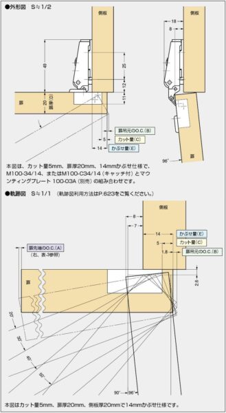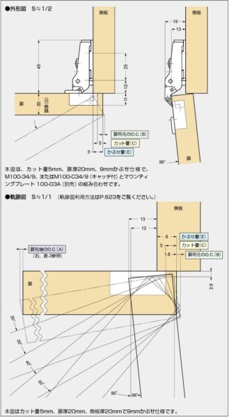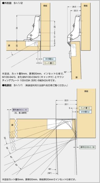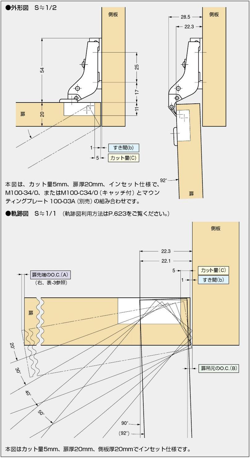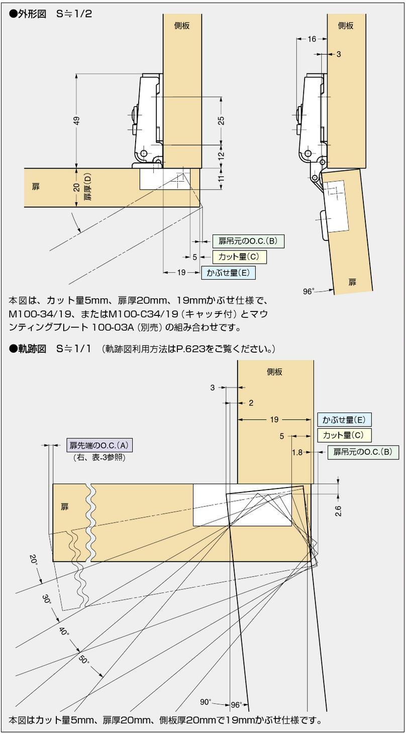 LAMP スライド丁番 M100シリーズ キャッチとは スライド丁番の「キャッチ」とは本体の首のところに付いたバネのことです。 キャッチあり・なしの見た目の違いはありません。 キャッチあり 扉がある程度閉まるとバタンと閉まるもの キャッチなし 自動で閉まらない扉の場合 3個付けの時「キャッチあり」3個だと力が強すぎるので真ん中のものを「キャッチなし」にしたりします 座金(マウンティングプレート)とは 座金(マウンティングプレート)とは本体を取り付けるための金具です。 購入の際、二点座、三点座を選んでいただきます。 「二点座」、「三点座」の違いはネジの取り付ける数です。お好みで選ばれて結構です。 ■取付ビスは別売りです■ M100-34/19 19ミリかぶせ 96度開き 26カップ座金付 品番 付加機能 入数 価格 購入数 M100-34/19 キャッチあり 1個 610 二点座三点座 - + M100-34/19 キャッチなし 1個 530 二点座三点座 - + M100-34/14 14ミリかぶせ 96度開き 26カップ座金付 品番 付加機能 入数 価格 購入数 M100-34/14 キャッチあり 1個 615 二点座三点座 - + M100-34/14 キャッチなし 1個 560 二点座三点座 - + M100-34/9 9ミリかぶせ 96度開き 26カップ座金付 品番 付加機能 入数 価格 購入数 M100-34/9 キャッチあり 1個 625 二点座三点座 - + M100-34/9 キャッチなし 1個 565 二点座三点座 - + M100-34/0 インセット 90度開き 26カップ座金付 品番 付加機能 入数 価格 購入数 M100-34/0 キャッチあり 1個 740 二点座三点座 - + M100-34/0 キャッチなし 1個 700 二点座三点座 - + スライド丁番用ビス 品番 入数 価格 購入数 十字穴付ニッケルメッキ 3.5×16 タッピングA型丸頭 50個 1箱(1500個) 1袋 100 - + 1箱 2,100 - + スライド丁番用キリ 26カップ用 品番 入数 価格 購入数 スライド丁番用キリ 26カップ用 1個 2,100 - + 金具の取り付け 二点座 マウンティングプレート 100-03A 三点座 マウンティングプレート 100-04A-W-30