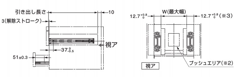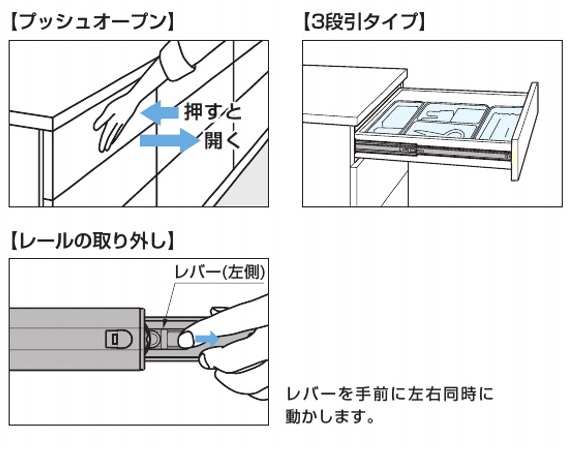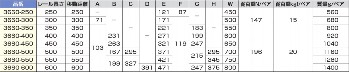 LAMP スライドレール3660 プッシュオープン インナーメンバーを完全に引き出せる3段引のスライドレールです。 新機構PPD(プルプロテクトデバイス)が、引き出しをプッシュせず 強制的に引き出した際の機構部へのダメージを最小限にします。 レバー操作でインナーメンバーを取り外せます。 プッシュオープン仕様のため筐体にハンドル取付が不要となり、フラットな外観も可能です。 スライドレール3660 プッシュオープン 材質 鋼 品名 レール長さ 入数 (左右セット) 価格 購入数 3660-250 250 1セット 2,340 - + 3660-300 300 1セット 2,340 - + 3660-350 350 1セット 2,610 - + 3660-400 400 1セット 2,680 - + 3660-450 450 1セット 2,815 - + 3660-500 500 1セット 2,880 - + 3660-550 550 1セット 2,950 - + 3660-600 600 1セット 3,285 - + スライドレール3660 プッシュオープン 箱売り 材質 鋼 品名 レール長さ 入数 (左右セット) 価格 購入数 3660-250(20セット) 250 1箱 43,660 - + 3660-300(20セット) 300 1箱 43,660 - + 3660-350(10セット) 350 1箱 24,325 - + 3660-400(10セット) 400 1箱 24,950 - + 3660-450(10セット) 450 1箱 26,195 - + 3660-500(10セット) 500 1箱 26,820 - + 3660-550(10セット) 550 1箱 27,440 - + 3660-600(10セット) 600 1箱 30,560 - +