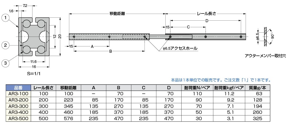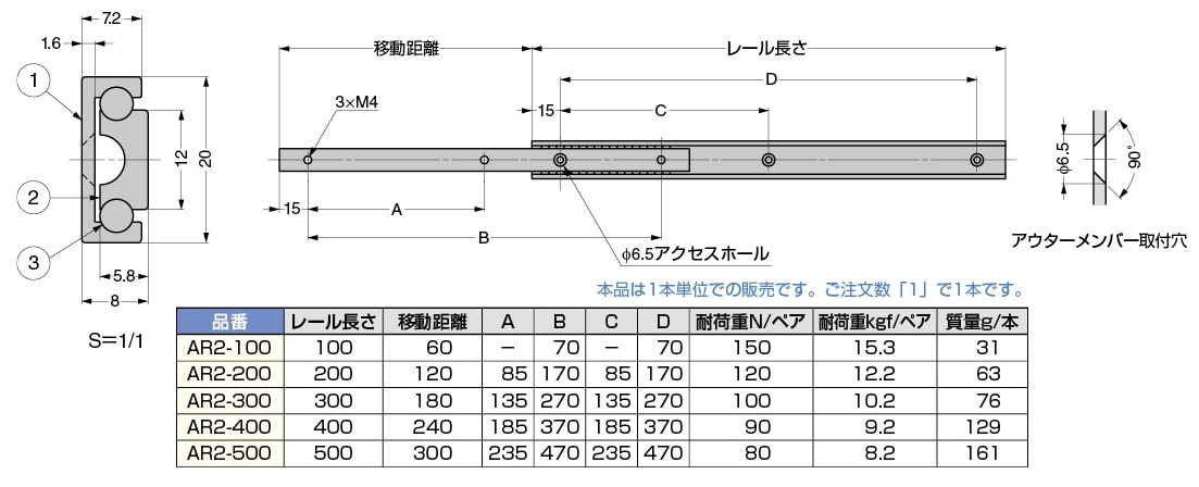 LAMP アルミ合金製スライドレール AR2/AR3 軽量用 アルミ押出し材製でたわみが少なく、小型・軽量です。 アルミ合金製スライドレール 軽量用 AR2 材質 アルミニウム合金 鋼 3/4スライドの2段引スライドレールです。 品名 レール長さ 耐荷重 ペア(kgf) 入数 価格 購入数 AR2-100 100 15.3 1本 565 - + AR2-200 200 12.2 1本 910 - + AR2-300 300 10.2 1本 1,990 - + AR2-400 400 9.2 1本 2,610 - + AR2-500 500 8.2 1本 3,040 - + アルミ合金製スライドレール 軽量用 AR3 材質 アルミニウム合金 鋼 インナーメンバーを完全に引き出せる3段引のスライドレールです。 品名 レール長さ 耐荷重 ペア(kgf) 入数 価格 購入数 AR3-100 100 11.2 1本 1,470 - + AR3-200 200 9.2 1本 2,210 - + AR3-300 300 7.1 1本 3,050 - + AR3-400 400 5.1 1本 4,400 - + AR3-500 500 3.1 1本 5,360 - +
