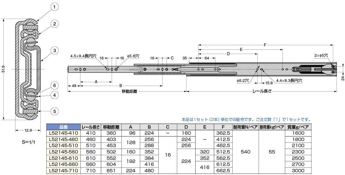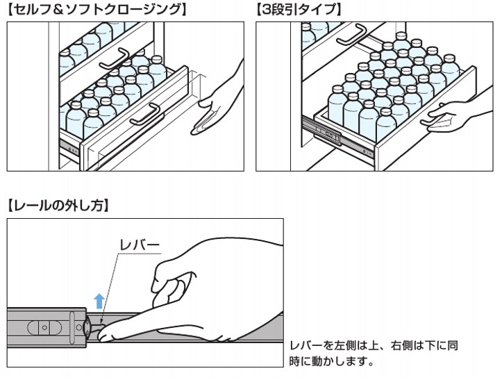 LAMP スライドレール L52145 セルフ&ソウトクロージング機構付 3段引のスライドレールです。 レバー操作でインナーメンバーを取り外せます。 セルフ&ソフトクロージング機構が作動する位置はレール全閉時より50mm手前です。 引き出しの最大幅は、レール長さ+200mmです。 スライドレール L52145 セルフ&ソウトクロージング機構付 材質 鋼 品名 レール長さ 耐荷重 (kgf) 入数 (左右セット) 価格 購入数 L52145-410 410 60 1セット 5,580 - + L52145-460 460 70 1セット 5,880 - + L52145-510 510 70 1セット 6,280 - + L52145-560 560 65 1セット 6,720 - + L52145-610 610 60 1セット 6,960 - + L52145-660 660 60 1セット 7,260 - + L52145-710 710 55 1セット 7,880 - + スライドレール用ビス 品名 入数 価格 購入数 十字穴付ユニクロメッキ3.5X16 タッピングA型トラス頭(50個) 1袋 120 - + 十字穴付ユニクロメッキ3.5X16 タッピングA型トラス頭(1000個) 1箱 2,200 - +