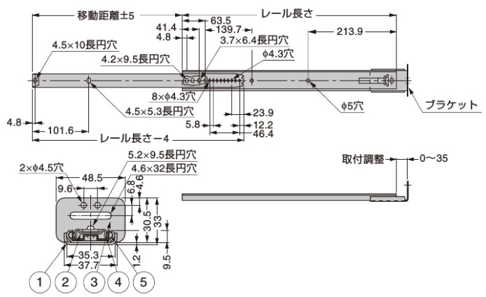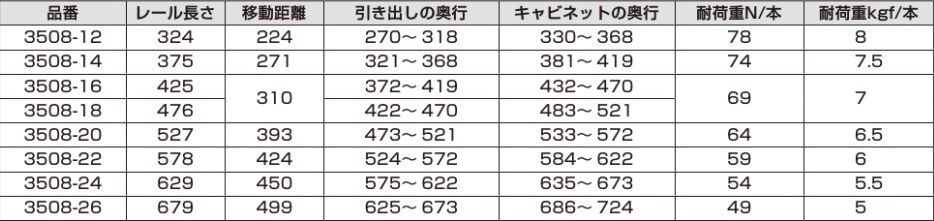 LAMP スライドレール 3508 3/4スライドの2段引きのスライドレールです。 レールを全開するときに、摩擦抵抗によりブレーキがかかり止ります。 さらに強く引くとレールは抜けます。 引き出しの底にレールを取り付ける底付タイプのスライドレールです。 スライドレール3508 材質 鋼 品名 レール長さ 移動距離 耐荷重 入数 価格 購入数 3508-12 324 224 8 1本 1,090 - + 3508-14 375 271 7.5 1本 1,165 - + 3508-16 425 310 7 1本 1,240 - + 3508-18 476 310 7 1本 1,475 - + 3508-20 527 393 6.5 1本 1,630 - + 3508-22 578 424 6 1本 1,700 - + 3508-24 629 450 5.5 1本 1,780 - + 3508-26 679 499 5 1本 2,020 - + スライドレール用ビス 品名 入数 価格 購入数 十字穴付ユニクロメッキ3.5X16 タッピングA型トラス頭(50個) 1袋 120 - + 十字穴付ユニクロメッキ3.5X16 タッピングA型トラス頭(1000個) 1箱 2,200 - +