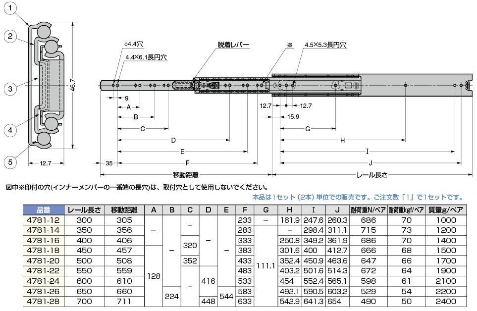 LAMP ステンレス鋼製 スライドレール 4781(三段引き) レバー操作でインナーメンバーを取り外せます。 レールを全閉時に保持する簡易的なキャッチ機能付きです。 スライドレール4781(三段引き) 材質 鋼 品名 レール長さ 耐荷重 (kgf) 入数 (左右セット) 価格 購入数 4781-12 300 83 1組 4,170 - + 4781-14 350 85 1組 4,400 - + 4781-16 400 83 1組 4,960 - + 4781-18 450 81 1組 5,430 - + 4781-20 500 79 1組 5,820 - + 4781-22 550 77 1組 6,215 - + 4781-24 600 75 1組 6,920 - + 4781-26 650 68 1組 7,550 - + 4781-28 700 63 1組 7,865 - + スライドレール用ビス 品名 入数 価格 購入数 十字穴付ユニクロメッキ3.5X16 タッピングA型トラス頭(50個) 1袋 120 - + 十字穴付ユニクロメッキ3.5X16 タッピングA型トラス頭(1000個) 1箱 2,200 - +