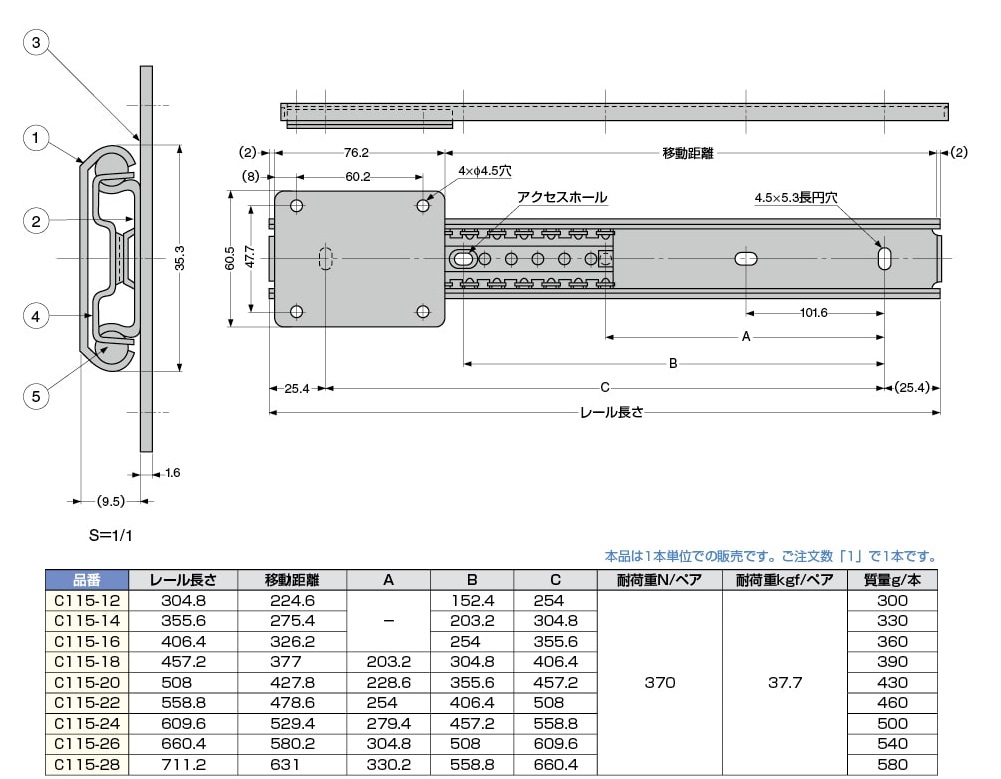 LAMP スライドレール C115 インナーメンバーが常にリテーナーの中に収まってスライドするため、正確な往復運動が得られます。 スライドレール C115 材質 鋼 品名 レール長さ 移動距離 入数 価格 購入数 C115-12 305 225.6 1本 3,099 - + C115-14 356 276.4 1本 3,115 - + C115-16 406 327.2 1本 3,179 - + C115-18 457 378 1本 3,387 - + C115-20 508 428.8 1本 3,467 - + C115-22 559 479.6 1本 3,563 - + C115-24 610 530.4 1本 3,643 - + C115-26 660 581.2 1本 3,657 - + C115-28 711 632 1本 3,843 - + スライドレール用ビス 品名 入数 価格 購入数 十字穴付ユニクロメッキ3.5X16 タッピングA型トラス頭(50個) 1袋 120 - + 十字穴付ユニクロメッキ3.5X16 タッピングA型トラス頭(1000個) 1箱 2,200 - +