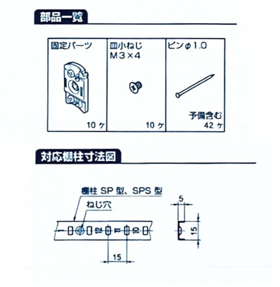 LAMP ステンレス鋼製棚受・棚柱 SPS型 LAMP ステンレス鋼製棚受・棚柱 SPS型 1820mm 材質 ステンレス鋼 長さ 1820mm ビス穴 10 棚板の高さ調整が15mmピッチで行え、数字の刻印付きなので、高さ調整が簡単です。 ステンレス鋼製の棚柱で、重量物を載せても変形しにくい構造です。 棚受はステンレス鋼製棚受SPB-20、SPB-15R、SPF-20、をご使用下さい。 品番 色 入数 価格 購入数 SPS-1820 単品 HL 1本 370 日時指定・代引き不可 - + SPS-1820 10本 HL 1本 3,350 日時指定・代引き不可 - + SPS-1820 箱売(60本) HL 1本 18,000 日時指定・代引き不可 - + SP-1820WT 単品 ホワイト 1本 1,085 日時指定・代引き不可 - + SP-1820WT 10本 ホワイト 1セット 10,130 日時指定・代引き不可 - + SP-1820WT 箱売(60本) ホワイト 1ケース 54,200 日時指定・代引き不可 - + SPS型用棚受 SPB-15R 材質 ステンレス鋼 耐荷重 100kgf(4ヶ) 棚柱への取り付け、取り外しがスピーディーで確実にできます。 カバー(エラストマー)付きで滑りにくく、ガラス棚板などにも使えます。 品番 色 入数 価格 購入数 SPB-15R-WT ホワイト 1個 109 - + SPB-15R-WT 300個 ホワイト 1箱 26,170 - + SPB-15R ブラック 1個 109 - + SPB-15R 300個 ブラック 1箱 26,170 - + SPS型用棚受 SPB-20T型 材質 ステンレス鋼 耐荷重 45kgf(4ヶ) 棚柱への取り付け、取り外しがスピーディーで確実にできます。 振動などで外れにくい構造です。 ヘアライン仕上は、保護テープ付と、現場での手間が省けゴミが出ない保護テープなしの仕様があります。 品番 色 入数 価格 購入数 SPB-20 HL 1個 24 - + SPB-20 箱売(300個) HL 1箱 6,220 - + SPB-20WT ホワイト 1個 86 - + SPB-20WT 箱売(300個) ホワイト 1箱 22,300 - + SPS型用棚受 SPF-20型 材質 ステンレス鋼 耐荷重 80kgf(ヶ4) 棚柱への取り付け時に「カチッ」とクリック感が得られ、取り付けが確実に行えます。 薄型形状のため、収納物の邪魔にならず、本棚などの使用に最適です。 ヘアライン仕上は、保護テープ付と、現場での手間が省けゴミが出ない保護テープなしの仕様があります。 品番 色 入数 価格 購入数 SPF-20 HL 1個 50 - + SPF-20 箱売(300個) HL 1個 12,870 - + SPF-20WT ホワイト 1個 145 - + SPF-20WT 箱売(300個) ホワイト 1箱 37,770 - + SPS型用レベル調整棚受 SPF-20LC 材質 ステンレス鋼(SUS304)/シリコーンゴム(Q) 耐荷重 80kgf(4ケ) ステンレス鋼製棚柱 SP型、SPS型専用の棚受です。 カバーを上下差し替えることで、棚受の高さが調整できます。 透明感があり滑りにくい材質なので、ガラス棚に最適です。 品番 色 入数 価格 購入数 SPF-20LC HL 1個 79 - + SPF-20型用棚ズレ防止棚受 SPF-20A型 材質 ポリエチレン(PE) 質量 4g 棚受 SPF-20型に差し込んで使用する専用の棚ズレ防止棚受です。 清掃時などに、棚のズレによる脱落を防ぎます。 棚柱中心から棚板戸先までの距離は19mmから30mm対応です。 品番 色 入数 価格 購入数 SPF-20A ホワイト 1個 34 - + SPF-20A 箱売(100個) ホワイト 1箱 3,230 - + SPS型用棚柱用ブラケット SPB-200 材質 ステンレス鋼 ポリプロピレン 耐荷重 2本 10kgf 3本 20kgf 本品2本または3本で棚板1枚を取り付けられます。 棚板を簡易的に保持する、ずれ止め付きです。 棚板の奥行は3段階から選べます。 本品が不意に棚柱から外れるのを防止する抜け止め付です。 ガラス棚板の使用もできます。 品番 色 入数 価格 購入数 SPB-200 ホワイト 1個 1,230 - + SPS型棚柱用フック SP-35 材質 亜鉛合金 耐荷重 5kgf 縦使い、横使いの棚柱両方に使用できます。 品番 色 入数 価格 購入数 SP-35 ニッケルメッキ 1個 165 - + SPH型、SP型、SPS型用 棚柱用エンドキャップ SP-18E 材質 ABS樹脂 推奨ねじ 皿木ねじ呼び3.1 棚柱の端面に取り付けるエンドキャップです。 品名 色 入数 価格 購入数 SP-18E-BL ブラック 1個 55 - + SP-18E-WT ホワイト 1個 55 - + SPH型、SP型、SPS型用 棚柱用エンドキャップ SPW-EC20 ホワイトブラウン 材質 ポリプロピレン(PP) 質量 2g 棚柱の端面に取り付けるエンドキャップです。 一体型のフタを閉めることで取付ねじが隠せます。 品名 色 入数 価格 購入数 SPW-EC20-WT ホワイト 1個 34 - + SPW-EC20-BR ブラウン 1個 34 - + 棚柱用木ねじ 材質 ステンレス サイズ 色 入数 価格 購入数 3.1×22(50個) ヘアーライン 1袋 230 - + 3.1×32(50個) ヘアーライン 1袋 340 - + SP・SPS型用 石膏ボード用棚柱固定パーツ SP-SK 付属品 石膏ピンφ1.0(ステンレス鋼) 十字穴付き皿小ねじ M3×4(ステンレス鋼) SP・SPS型棚柱を9.5mm厚、12.5mm厚の石膏ボードに取り付けるための部品です。 棚柱に固定パーツをねじ止めし、ピンを打ち込むだけで簡単に固定できます。 パーツ自体に仮保持機能がついているため、ねじ止めする際に位置がズレません。 固定パーツの位置出し不要!棚柱の正面から直接ピンを打ち込めるため簡単に壁に取り付けられます。 品名 入数 価格 購入数 石膏ボード用棚柱固定パーツ SP-SK 1セット 785 - + 石膏ピン取付工具 SK-JIG10-GN ハンマーなどを使わずに、安全・簡単に石膏ボードに石膏ピンを押し込めます。 石膏ボード用棚柱固定パーツ SP-SK型、AP-SK型や、 PXBノルディックラバーフックの取り付けに使用できます。 品名 入数 価格 購入数 石膏ピン取付工具 