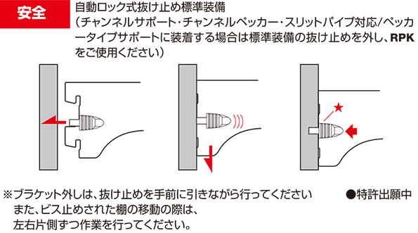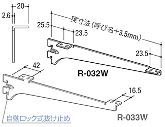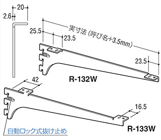 ロイヤル 木棚板専用水平ブラケットRタイプ ブラック ASF-1・AWF-5・ASF-10・AWF-15に使用できます。 クロームはこちら ホワイトはこちら ブラックはこちら ASF-1(棚柱) ブラックはこちら ロイヤル 木棚板専用水平ブラケットRタイプ R-032W/033W ブラック ビス穴数 4 材質 スチール特殊鋼 腕金具のアップ角度 0.75度 品番 長さ 入数 (左右セット) 価格 購入数 R-032W/033W BL 100 100 1セット 682 - + R-032W/033W BL 150 150 1セット 759 - + R-032W/033W BL 200 200 1セット 869 - + R-032W/033W BL 250 250 1セット 979 - + R-032W/033W BL 300 300 1セット 1,067 - + R-032W/033W BL 350 350 1セット 1,210 - + ロイヤル 木棚板専用水平ブラケット(中間受け専用)Rタイプ R-034W ブラック ビス穴数 2 材質 スチール特殊鋼 腕金具のアップ角度 0.75度 品番 長さ 入数 価格 購入数 R-034W BL 100 100 1本 341 - + R-034W BL 150 150 1本 380 - + R-034W BL 200 200 1本 435 - + R-034W BL 250 250 1本 490 - + R-034W BL 300 300 1本 534 - + R-034W BL 350 350 1本 605 - + ロイヤル 木棚板専用水平ブラケットRタイプ R-132W/133W ブラック ビス穴数 4 材質 スチール特殊鋼 腕金具のアップ角度 0.75度 品番 長さ 入数 (左右セット) 価格 購入数 R-132W/133W BL 250 250 1セット 1,023 - + R-132W/133W BL 300 300 1セット 1,155 - + R-132W/133W BL 350 350 1セット 1,265 - + R-132W/133W BL 400 400 1セット 1,485 - + R-132W/133W BL 450 450 1セット 1,815 - + ロイヤル 木棚板専用水平ブラケットRタイプ R-134W ブラック ビス穴数 2 材質 スチール特殊鋼 腕金具のアップ角度 0.75度 品番 長さ 入数 価格 購入数 R-134W BL 250 250 1本 512 - + R-134W BL 300 300 1本 578 - + R-134W BL 350 350 1本 633 - + R-134W BL 400 400 1本 743 - + R-134W BL 450 450 1本 908 - + 固定用Wタッピング WT-P ブラック サイズ 用途 入数 価格 購入数 16mm 木下地 1袋 484 - + 現場用簡易固定ダボ WD-6-12 クローム 品名 入数 価格 購入数 現場用簡易固定ダボ WD-6-1 1セット(10個) 550 - + 棚板レベル矯正金具 LW-01 クローム 品名 入数 (3ピースセット) 価格 購入数 棚板レベル矯正金具 LW-01 1セット(3ピース) 187 - + ベッカー用抜け止め RPK ステンレス 品名 入数 価格 購入数 ベッカー用抜け止め RPK 1セット(10個) 360 - +
