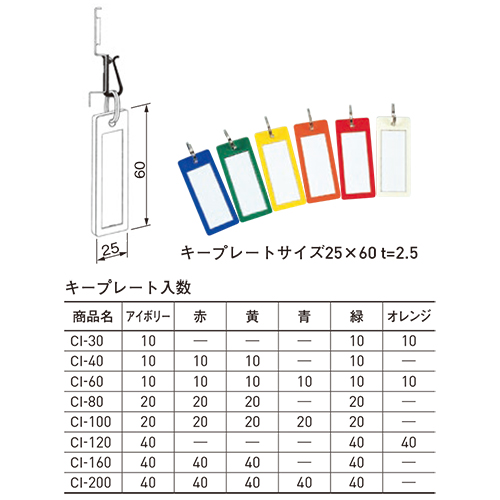 タチバナ キーボックス CI/FI キーボックス FI|固定式 CI|シリンダー錠 タチバナ キーボックス FI アイボリー 固定式 テプラ・ネームランド等の18mmのテープも使えます。 シリンダー錠は鍵が2本付いています。 FIタイプのシリンダー錠は全て同一キーとなります。 扉はスプリングフックでピタリ、錠前も付いています。 キーハンガーに整理見出しが付いていて必要な鍵が一目でわかります。 材質 スチール 仕上 ポリエステル系粉体塗装 色 アイボリー 品名 H×間口×奥行mm 入数 価格 購入数 FI-10 280×200×53 1個 4,185 - + FI-15 400×200×53 1個 4,995 - + FI-20 400×260×53 1個 6,410 - + FI-30 400×350×53 1個 8,030 - + タチバナ キーボックス CI(シリンダー錠)アイボリー 携帯・固定兼用 自由に持ち運べるよう、U型フックでキープレートが外れにくくなっています。 扉はマグネットでピタリ、錠前も付いています。 キーハンガーに整理見出しが付いていて必要な鍵が一目でわかります。 CI-120・160・200には大型一覧表が付いています。 テプラ・ネームランド等の18mmのテープも使えます。 シリンダー錠の鍵は2本付いています。 材質 スチール 仕上 ポリエステル系粉体塗装 色 アイボリー 品名 H×間口×奥行mm 入数 価格 購入数 CI-30 400×310×55 1個 9,165 - + CI-40 300×330×70 1個 11,635 - + CI-60 400×330×70 1個 14,105 - + CI-80 500×330×70 1個 17,875 - + CI-100 600×330×70 1個 21,060 - + CI-120 450×400×120 1個 29,900 - + CI-160 575×400×120 1個 37,115 - + CI-200 700×400×120 1個 44,330 - +