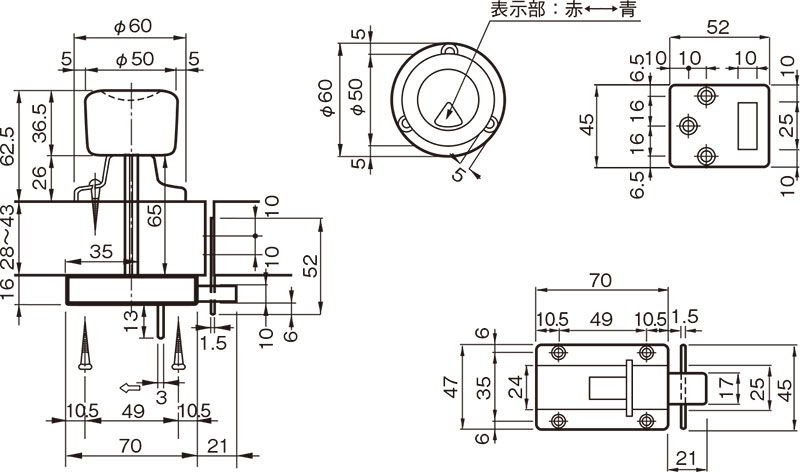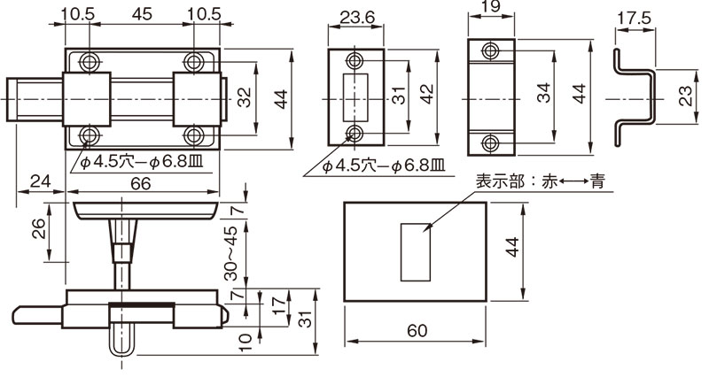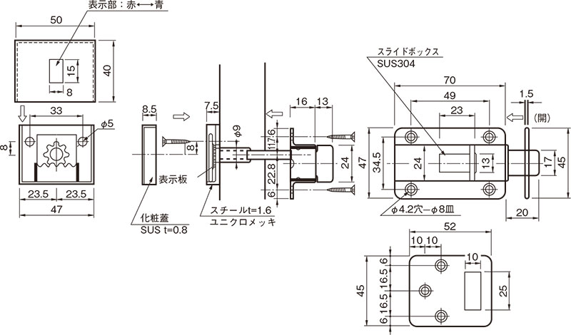 杉田エース トイレブース・ラバトリー 【メーカー】 ユーシン・ショウワはこちら シブタニはこちら ベストはこちら クマモトはこちら 杉田エースはこちら 杉田エース ACEラバトリヒンジ トイレの扉にご使用いただけます。スプリング入りのヒンジにより、自動的に扉を閉めることができます。 止めピンの位置調整により、開放式または自閉式にすることができます。 新機構を採用しており、本体を分解してスプリングを交換する必要がありません。 常にスプリングが正しい働きをする構造です。 内開き、外開き、左勝手、右勝手いずれにもご使用いただけます。 【ご注意】 通常は、内開き用にセットしてあります。 左右勝手は、上下を逆にして取付けることで変更できます。 材質 SUS304 仕上 ヘアライン 扉厚 28 ~ 43 耐荷重 15kgf 付属部品 SUS十字穴付皿木ネジ 3.1×25:6本 真鍮調整ボルト:3本 化粧カバーナット:3個 型番 入数 価格 購入数 127-630 1個 4,770 - + 杉田エース ACE面付ラバトリヒンジ 止めピンの位置調整により、開放式または自閉式にすることができます。 新機構を採用しており、本体を分解してスプリングを交換する必要がありません。 常にスプリングが正しい働きをする構造です。 トイレの扉にご使用いただけます。スプリング入りのヒンジにより、自動的に扉を閉めることができます。 内開き、外開き、いずれにもご使用いただけます。 【ご注意】 通常は、内開きにセットしてあります。 ガラス入りドアには、ご使用にならないでください。 材質 SUS304 仕上 ヘアライン 耐荷重 15kgf 付属部品 SUS十字穴付皿木ネジ 3.8×25:12本 型番 入数 価格 購入数 127-631 1個 6,760 - + 杉田エース ラッチ式表示器 主にトイレの内・外開き扉用などとしてご使用いただけます。 材質 SUS304 仕上 研磨 扉厚 30 ~ 45 重量 200g 付属部品 SUS十字穴付皿木ネジ 3.1×20:6本 3.1×16:2本 型番 入数 価格 購入数 127-657 1個 1,230 - + 杉田エース スライドボルト(受付き) トイレの内・外開き扉用、一般扉の内締りなどとしてご使用いただけます。 材質 SUS304 仕上 研磨 重量 120g 付属部品 SUS十字穴付皿木ネジ 3.1×20:6本 型番 入数 価格 購入数 127-656 1個 660 - + 杉田エース スライド表示器 トイレの内・外開き扉用の表示付ラッチなどとしてご使用いただけます。 特殊装置により軸の回転で表示板がスライドしますので、扉にφ10の穴をあけるだけで取付けができます。 材質 SUS304 仕上 研磨 扉厚 26 ~ 40 重量 200g 付属部品 SUS十字穴付皿木ネジ 3.5×20:2本 3.5×25:7本 型番 入数 価格 購入数 127-654 1個 1,770 - + 杉田エース 握玉付表示器 主にトイレの外開き扉用などにご使用いただけます。 非常開放装置付きです。 握玉は固定式で回転しません。 材質 SUS304 仕上 ヘアライン 扉厚 28 ~ 43 重量 300g 付属部品 SUS十字穴付皿木ネジ 3.5×25:10本 型番 入数 価格 購入数 127-659 1個 2,820 - + 杉田エース 取手付表示器 トイレ、物入れの外開き扉用などにご使用いただけます。 取手付のため固定玉等を付ける必要がありません。 材質 SUS304 仕上 研磨 扉厚 30 ~ 45 重量 250g 付属部品 SUS十字穴付皿木ネジ 3.1×20:6本 3.1×16:4本 型番 入数 価格 購入数 127-655 1個 1,770 - + 杉田エース スリムボルト トイレの内・外開き扉用、その他の扉の補助締りとしてご使用いただけます。 【ご注意】 軸芯がずれないようにし、垂直水平をしっかり出してお取付けください。 材質 SUS304 仕上 ヘアライン 重量 表示なし:250g、表示あり:380g、ハンドル付:400g 付属部品 SUS十字穴付皿木ネジ 、皿3.5×25:2本、半丸3.5×25:4本 型番 入数 価格 購入数 127-651 表示なし 1個 2,920 - + 127-652 表示付 1個 4,375 - + 127-653 ハンドル付 1個 4,880 - +