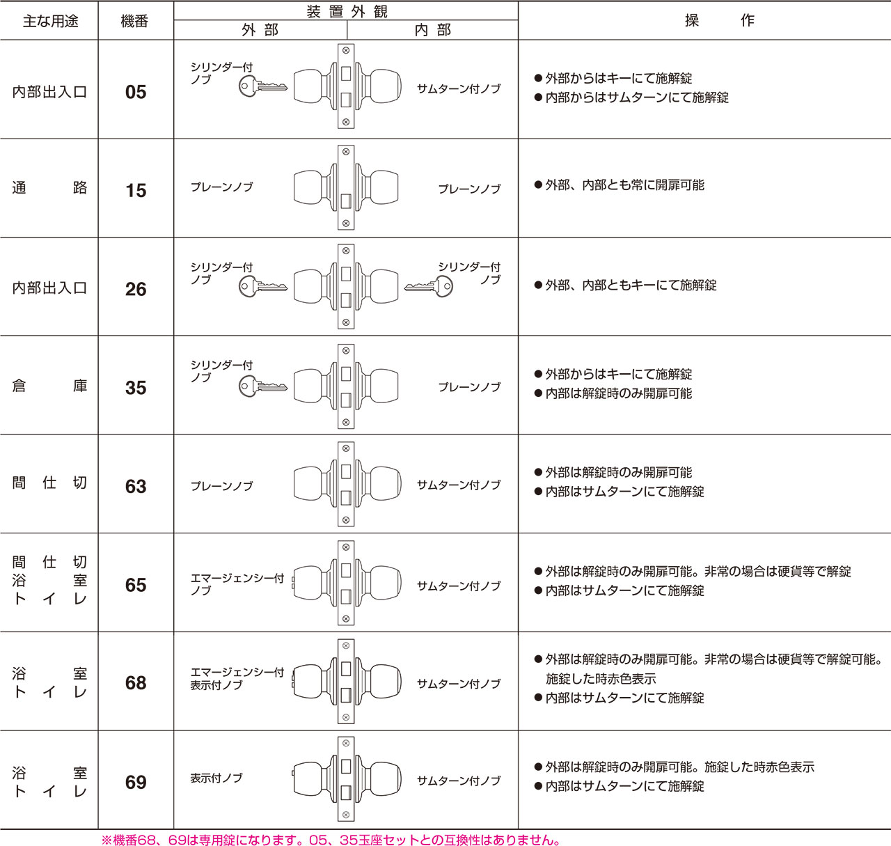 ユーシン・ショウワ[ミネベアショウワ] インテグラルロックISシリーズ 通路、浴室、倉庫、さらには表示錠まで豊富な機種を取り揃えたインテグラルロックのスタンダードタイプです。バックセットも数多く、また扉の取付寸法の範囲もワイドに設定しています。 機番一覧表 インテグラルロックISシリーズ IS-05-DA シリンダー錠/サムターン錠 外部からはキーにて施解錠、内部からはサムターンにて施解錠 IS-05-DA 主な用途 内部出入口 装置外観 外部 シリンダー錠 内部 サムターン錠 バックセット 60/64/90/100mm 扉厚 28:25~30mm 36:30~45mm シリンダー 5本ピンシリンダー 黄銅板製キー3本付 MK・GMK・その他各種装置可能 ノブ 材質:ステンレス鋼板製 仕上:ペーパー(S32P)/Aノブ ローズ 材質:ステンレス鋼板製 仕上:ペーパー(S32P) ストライク ストライク仕様(PDF) 品番 バックセット 扉厚 入数 価格 購入数 IS-05-DA-60-36 60 36 1個 7,900 - + IS-05-DA-64-36 64 36 1個 7,900 - + IS-05-DA-90-28 90 28 1個 8,750 - + IS-05-DA-90-36 90 36 1個 8,750 - + IS-05-DA-100-28 100 28 1個 8,750 - + IS-05-DA-100-36 100 36 1個 8,750 - + インテグラルロックISシリーズ IS-15-DA 空錠/空錠 外部・内部ともに常に開扉可能 IS-15-DA 主な用途 通路 装置外観 外部 空錠 内部 空錠 バックセット 60mm 扉厚 36:30~45mm シリンダー 5本ピンシリンダー 黄銅板製キー3本付 MK・GMK・その他各種装置可能 ノブ 材質:ステンレス鋼板製 仕上:ペーパー(S32P)/Aノブ ローズ 材質:ステンレス鋼板製 仕上:ペーパー(S32P) ストライク ストライク仕様(PDF) ※バックセット60mmに限りラッチボルトの位置は錠フロントのセンターとなります。 品番 バックセット 扉厚 入数 価格 購入数 IS-15-DA-60-36 60 36 1個 5,490 - + インテグラルロックISシリーズ IS-26-DA シリンダー錠/シリンダー錠 外部・内部ともにキーにて施解錠 IS-26-DA 主な用途 内部出入口 装置外観 外部 シリンダー錠 内部 シリンダー錠 バックセット 60/64mm 扉厚 36:30~45mm シリンダー 5本ピンシリンダー 黄銅板製キー3本付 MK・GMK・その他各種装置可能 ノブ 材質:ステンレス鋼板製 仕上:ペーパー(S32P)/Aノブ ローズ 材質:ステンレス鋼板製 仕上:ペーパー(S32P) ストライク ストライク仕様(PDF) 品番 バックセット 扉厚 入数 価格 購入数 IS-26-DA-60-36 60 36 1個 10,810 - + IS-26-DA-64-36 64 36 1個 10,810 - + インテグラルロックISシリーズ IS-63-DA 空錠/サムターン錠 外部は解錠時のみ開扉可能、内部はサムターンにて施解錠 IS-63-DA 主な用途 間仕切り 装置外観 外部 空錠 内部 サムターン錠 バックセット 60mm 扉厚 36:30~45mm シリンダー 5本ピンシリンダー 黄銅板製キー3本付 MK・GMK・その他各種装置可能 ノブ 材質:ステンレス鋼板製 仕上:ペーパー(S32P)/Aノブ ローズ 材質:ステンレス鋼板製 仕上:ペーパー(S32P) ストライク ストライク仕様(PDF) 品番 バックセット 扉厚 入数 価格 購入数 IS-63-DA-60-36 60 36 1個 6,180 - + インテグラルロックISシリーズ IS-68-DA 表示錠/サムターン錠 外部は解錠時のみ開扉可能。非常の場合は硬貨等で解錠、内部はサムターンにて施解錠 IS-68-DA 主な用途 浴室・トイレ 装置外観 外部 表示錠 内部 サムターン錠 バックセット 60/64mm 扉厚 36:30~45mm シリンダー 5本ピンシリンダー 黄銅板製キー3本付 MK・GMK・その他各種装置可能 ノブ 材質:ステンレス鋼板製 仕上:ペーパー(S32P)/Aノブ ローズ 材質:ステンレス鋼板製 仕上:ペーパー(S32P) ストライク ストライク仕様(PDF) 品番 バックセット 扉厚 入数 価格 購入数 IS-68-DA-60-36 60 36 1個 5,590 - + IS-68-DA-64-36 64 36 1個 5,590 - +